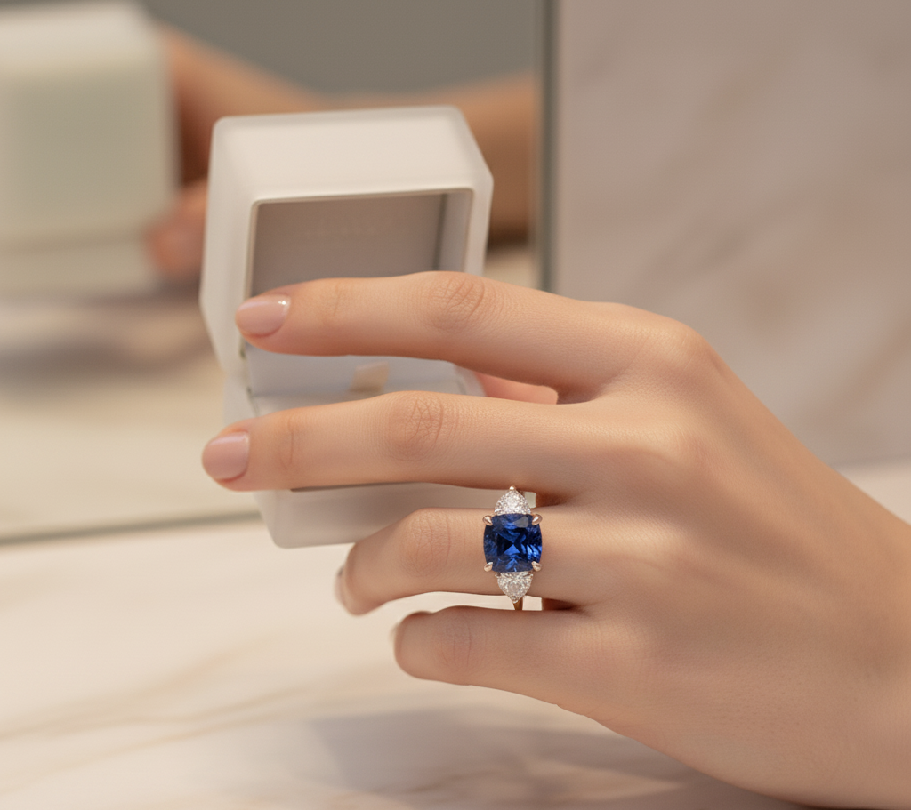 This elegant 18ct Yellow Gold Blue Sapphire Engagement Ring is a true masterpiece of elegance and sophistication. Radiating elegance and timeless charm, this stunning Three-Stone Engagement Ring features a captivating Cushion-Cut Deep Blue Sapphire at its centre, flanked by two Sparkling Heart -Shape Diamonds on each sides. This exquisite design beautifully blends classic sophistication with modern flair, making it a perfect symbol of lasting love and commitment. The Diamond is expertly cut  to maximize its brilliance, making it a stunning focal point.