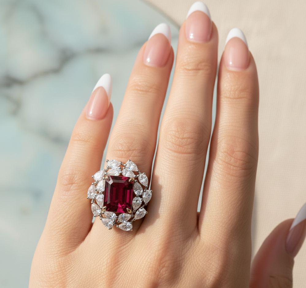 18ct Yellow Gold Lab Ruby with Pear Shape Lab Diamonds Engagement Ring. Showcases a stunning Ruby with Emerald-Cut Diamond at its centre, delicately secured in a luxurious Gold Claw Setting. The Ruby Diamond is encircled by a dazzling Halo of Pear-Shaped White Diamonds, artfully arranged to create a floral-inspired silhouette that enhances the centre stone’s brilliance and colour contrast. At the heart of this captivating piece lies a stunning Emerald Cut Intense Ruby Diamond, radiating feminine charm and timeless elegance.