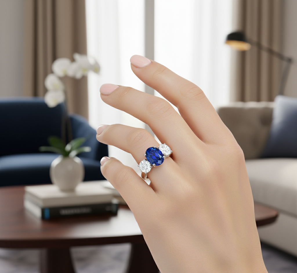 This stunning 18ct Gold Oval Blue Sapphire Lab Diamond Engagement Ring is a true masterpiece of elegance and sophistication. Radiating elegance and timeless charm, this stunning Three-Stone Engagement Ring features a captivating Oval-Cut Blue Sapphire at its centre, flanked by Two Round-Cut Sparkling Lab Diamonds on each side. This exquisite design beautifully blends classic sophistication with modern flair, making it a perfect symbol of lasting love and commitment. The Diamond is expertly cut to maximize its brilliance, making it a stunning focal point.