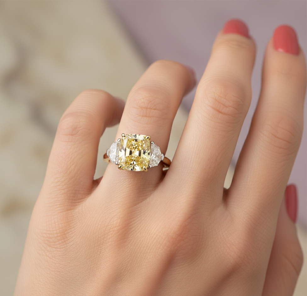 This elegant 18ct Gold Yellow Diamond Engagement Ring is a true masterpiece of elegance and sophistication. Radiating elegance and timeless charm, this stunning three-stone engagement ring features a captivating Cushion Modified Brilliant Fancy Vivid Yellow stone at its centre, flanked by two sparkling Cadillac Diamonds on sides. This Ring features 2.27ct Yellow Vivid Diamond and 0.41ct Cadillac Lab Diamonds on each side. This stunning design beautifully blends classic sophistication with modern flair, making it a perfect symbol of commitment and lasting love. The Diamond is expertly cut  to maximize its brilliance, making it a stunning focal point.