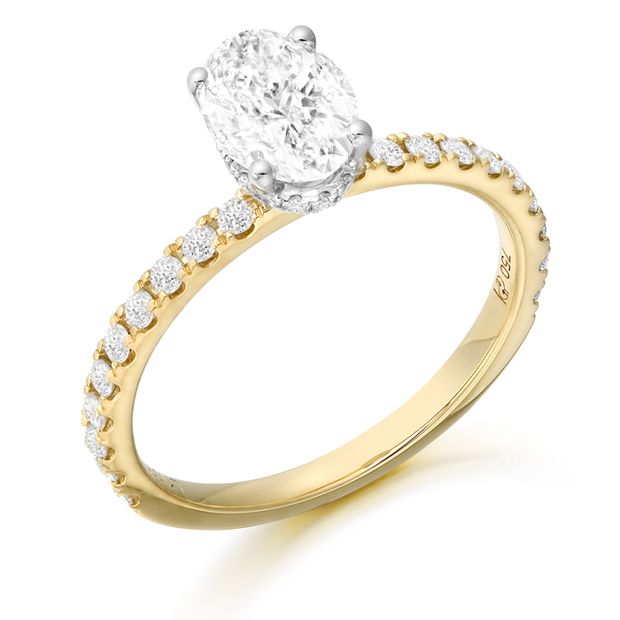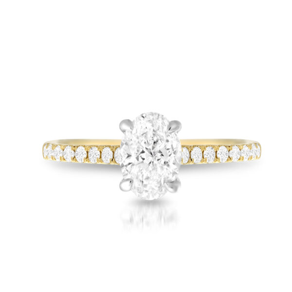 18ct Gold Lab Diamond Engagement Ring Simple in design but Sophisticated. This Diamond Engagement Ring with Diamond set shoulders will never loose it’s beauty. With its exquisite design and sheer brilliance, this is the Ring for you. This stunning Diamond Ring featuring dazzling Oval Shape stones and nestled with accent of stones in a Micro Pavé setting on shoulders. Fusing a vintage-inspired style with modern glamour for timeless style. This gorgeous Diamond Engagement Ring features a beautiful Brilliant Cut Diamond in the centre. This Oval Shape Lab Diamond produce with HPHT Process to achieve higher Clarity and Colour. An elegant Diamond Ring with a simple yet timeless design. This beautiful piece has been crafted in 18ct Two Tone Gold. Colour-E, Clarity-VVS2, Carat-1.35ct Cut – Oval, IGI Certified 1.00ct + 0.35ct = 1.35ct Total.