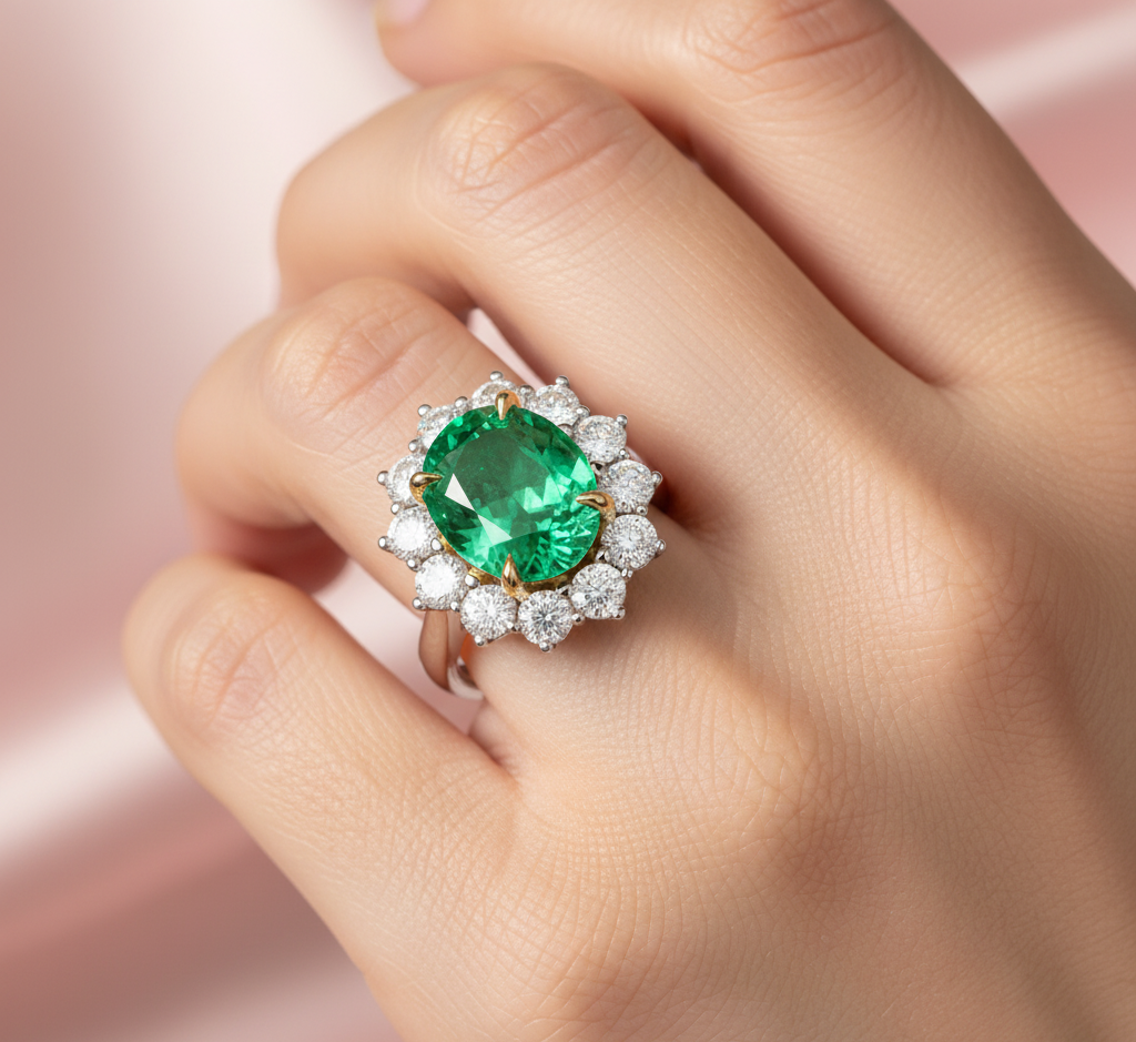 This beautiful piece has been crafted in 18ct Two Tone  Gold with Oval Cut Vivid Green Emerald Lab Diamond ,Carat Weight – 4.35ct Vivid Green Emerald Lab Diamond and 2.00ct Round Lab Diamonds.