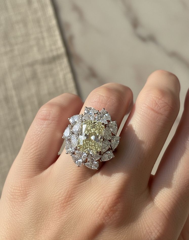 This beautiful piece has been crafted in 18ct White Gold with Radiant Cut Fancy Intense Yellow Lab Diamond ,Carat Weight – 5.81ct Fancy Intense Yellow Lab Diamond and 3.10ct Pear-Shaped White Diamonds in a floral halo design.