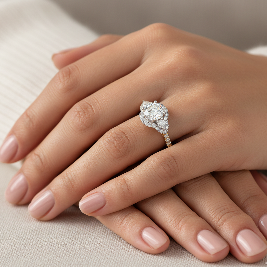 This beautiful piece has been crafted in 18ct Yellow Gold with Brilliant-Cut Lab Diamond of  1.19ct and 0.71ct  Diamonds on side.