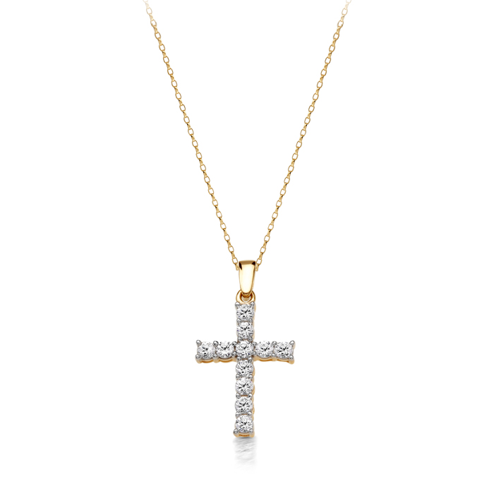 Gold CZ Cross Pendant and necklace. This Stone set Cross Pendant hangs beautifully giving this necklace a classic look that is as fashionable as it is sentimental. A great gift for her on any occasion.
