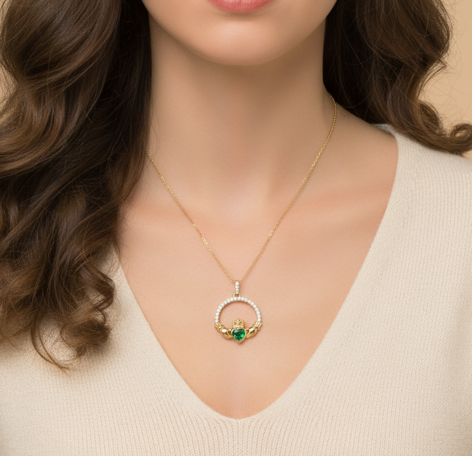 This 9ct Gold Cubic Zirconia Claddagh Pendant. Feel your Irish roots as you wear this sturdy Claddagh Pendant made in Ireland enriched with Micro Pave setting Green Cubic Zirconia set in place of the heart. This chic and sparkly Claddagh Pendant make a lovely Irish gift for any Irish woman, so purchase your pair today!