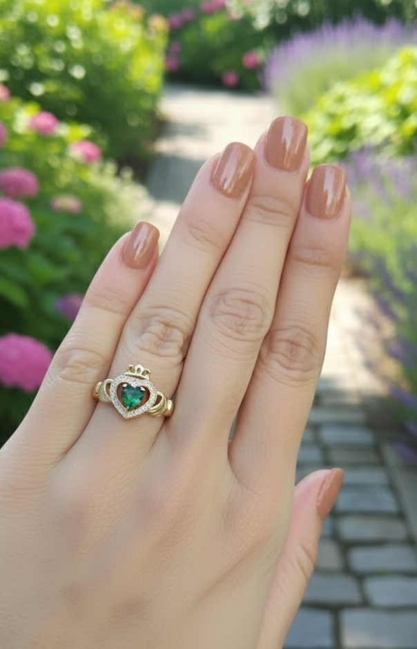 At its centre shines a stunning Heart-Shaped CZ Emerald, embraced by a delicate halo of Brilliant CZ Stones that add a touch of elegance and sparkle. Perfect as a promise ring, engagement ring, or meaningful gift, this timeless piece embodies deep sentiment and Irish heritage.
