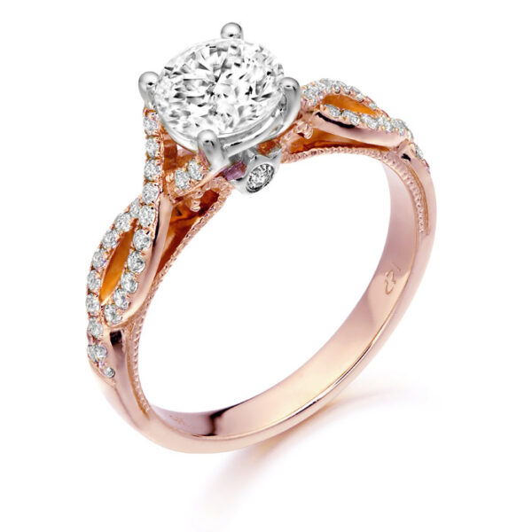 With Fluid curves this Rose Gold Ring is hemmed with Micropave stone setting shoulders with entwined design, soft undulations. The stones sparkle against the hypnotic high polished gold. This play of shimmering reflections flickers between shadow and light.   This Solitaire Ring evokes, harmony, balance and characteristics of classic contemporary look. The setting provides a delicate, feminine backdrop to the elegant, four-pronged setting highlights the beauty of the stone itself.