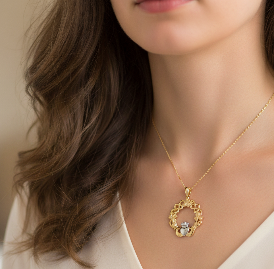 This Claddagh Pendant with Celtic knot and Shamrock pendant is the epitome of luxury and Irish Heritage. Designed with elegance and sophistication in mind, this stunning Pendant will ensure your look is always perfectly coordinated. Be swept away by the beauty of this Claddagh Pendant of Irish jewellery.