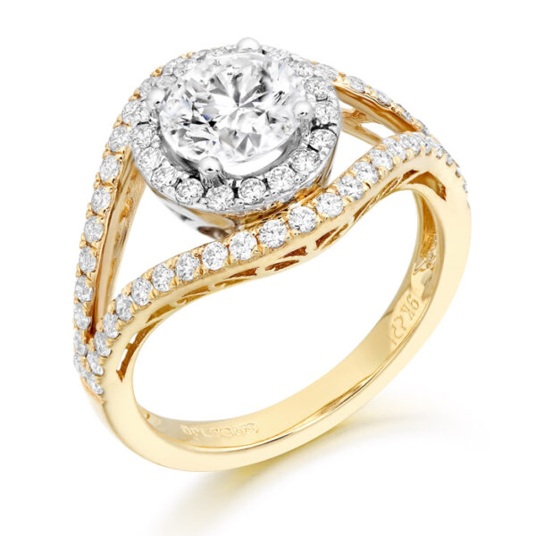 A stunning Engagement Ring comprising a central Diamond surrounded dramatically with a row of diamonds creating a halo effect.